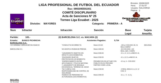 Y es que debido a que se registró un “enfrentamiento entre aficionados y Policía Nacional” y también el “lanzamiento de bengala encendida a terreno de juego” en el pasado partido en el que Macará venció 2x0 a los Toreros en su feudo, BSC fue sancionado con la prohibición de contar con público en el estadio Monumental para el duelo del próximo domingo 31 de agosto contra Universidad Católica.