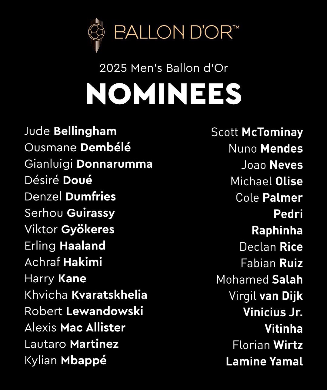 El proceso de selección fue el siguiente: cada uno de los 14 miembros del comité presentó una lista de 30 nominados sin decírselo a nadie más. Y el 15 de julio, dos días después de la Final del Mundial de Clubes en la que el Chelsea de Moisés Caicedo venció al PSG de Willian Pacho, se reunieron para debatir y los jugadores que más veces estaban mencionados en las 14 listas, quedaron finalmente considerados para los 30 candidatos finalistas que fueron presentados de manera oficial este jueves 7 de agosto.